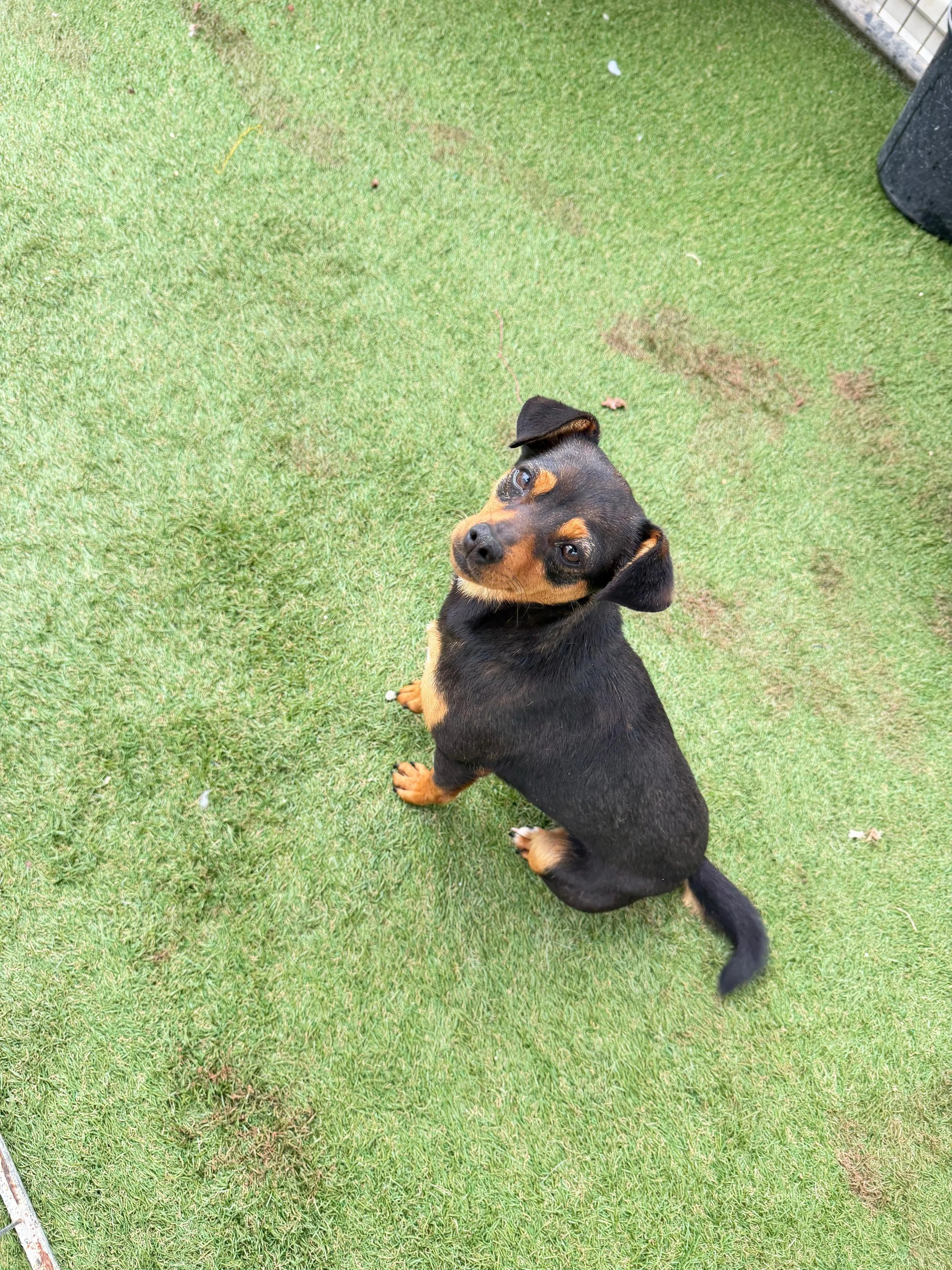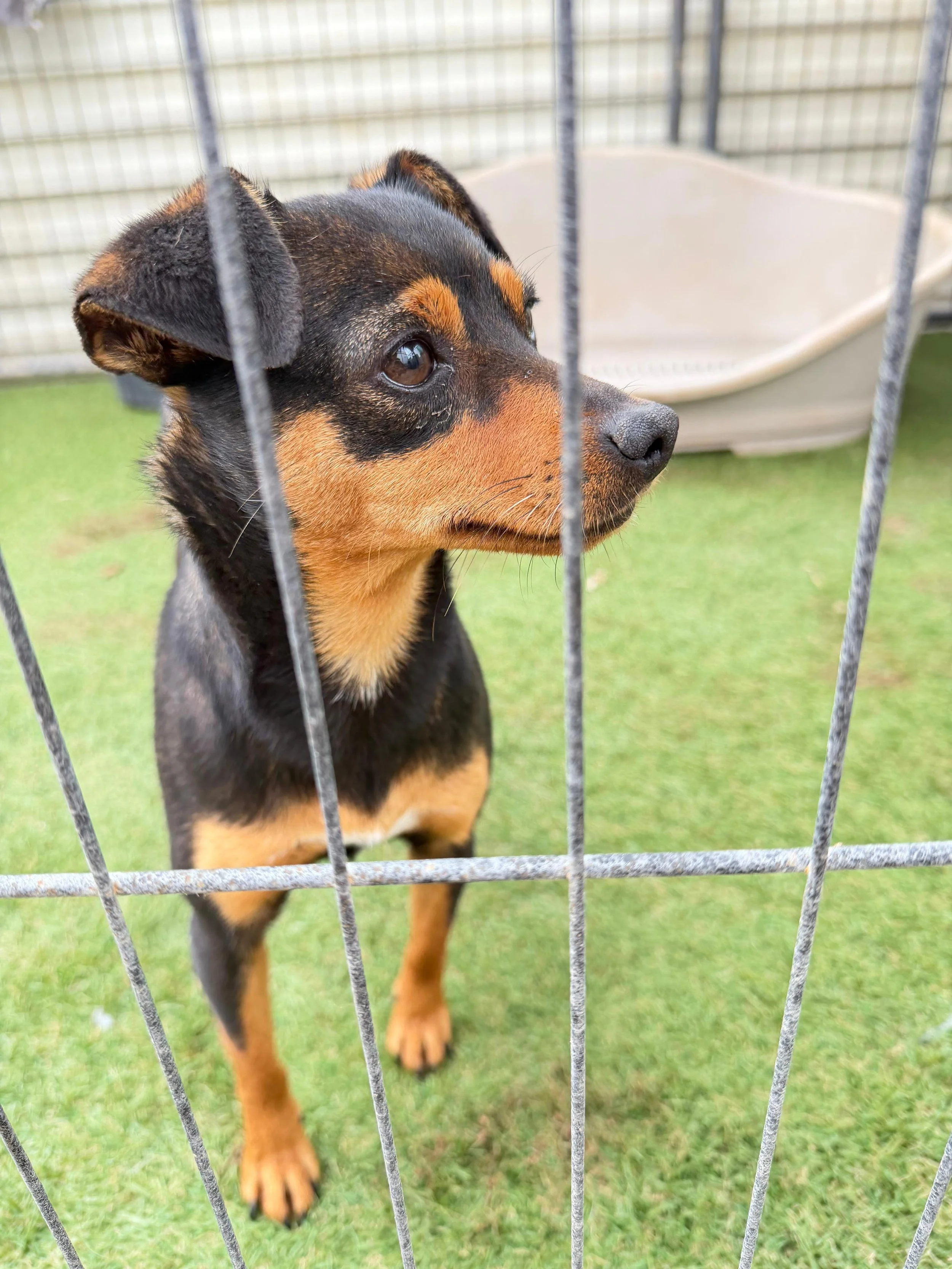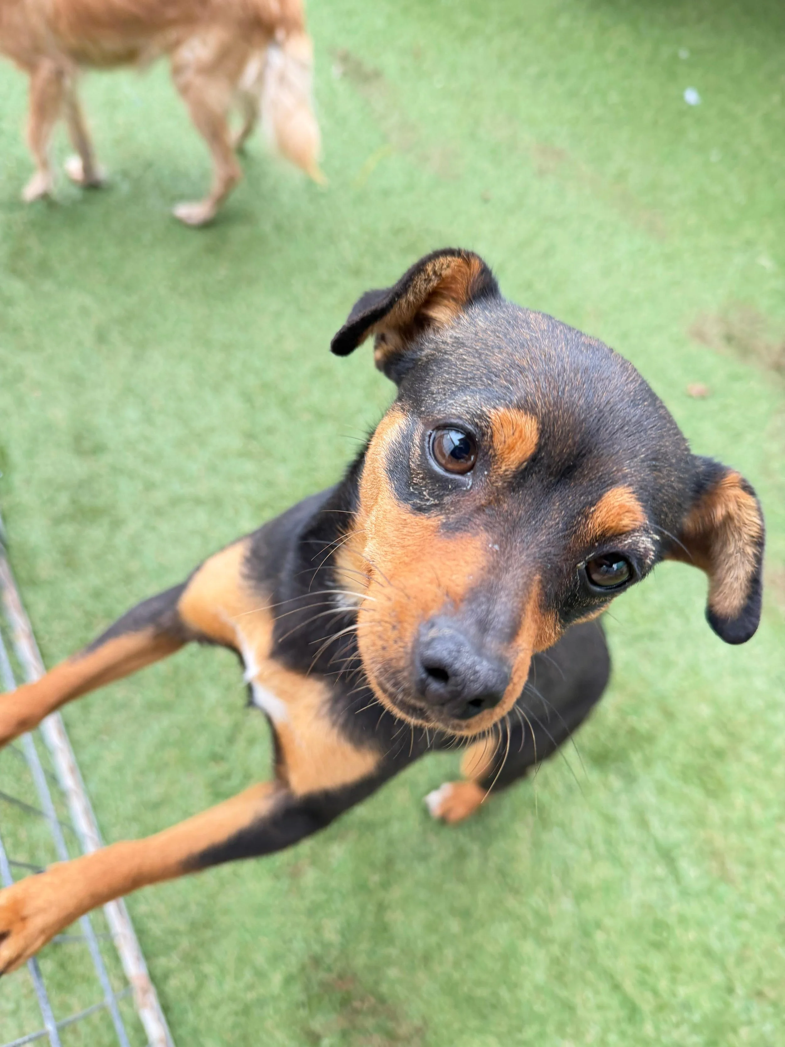 State of Health: healthyThis little pinscher mix female dog (born around 2024, approximately 2 years old) was found alone on a main road. She is now safe and has proven to be a very friendly and outgoing young dog.